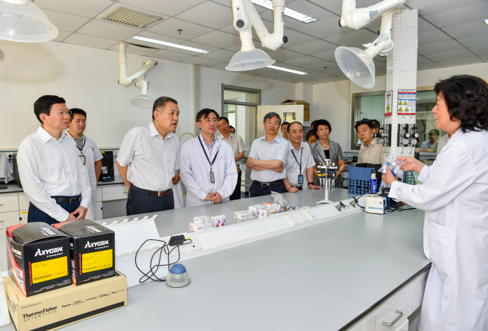 张茅先后考察了中检院生物制品检定所、化学药品检定所、标准物质与标准化管理中心和医疗器械检定所,详细了解化学药品与生物制品国家抽验、疫苗批签发情况,听取支持创新药品医疗器械优先检验,国家药品抽验,仿制药一致性评价检验,国家药品医疗器械及药品包装材料与辅料的标准物质管理,以及人工智能器械产品、组织工程产品检测及科研工作的介绍,并详细询问中检院人才梯队建设、科研设施投入、科技研发创新和二期工程建设等情况。对近年来中检院深入推进“放管服”改革,落实药品医疗器械审评审批制度改革,实施“人才兴检”和“科技强检”战略,尤其是在加快九价HPV疫苗上市、进口药品检验,严格执行标准品管理,和世界卫生组织等国际机构开展广泛合作,参与国际标准制修订,加强前沿科技研究,鼓励产业创新等方面取得的成绩,给予了充分肯定。
